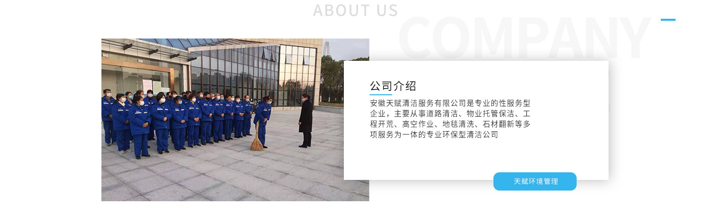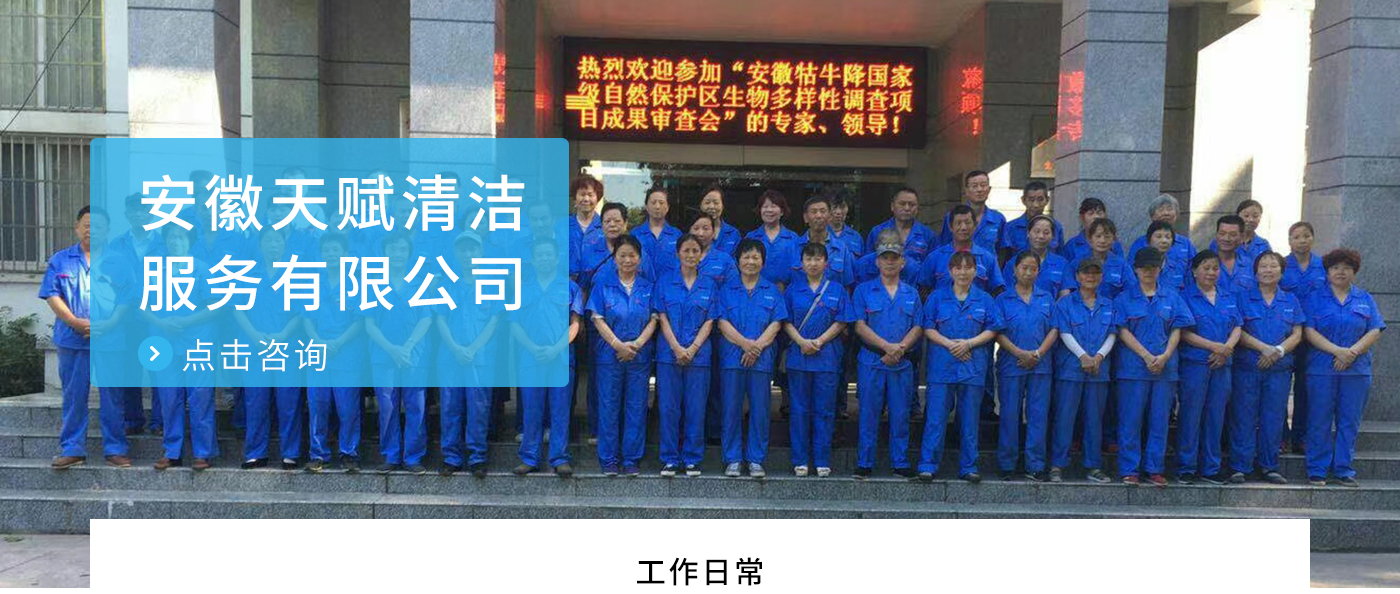 安徽天賦清潔服務有限公司是的服務型企業(yè),主要從事道路清潔、物業(yè)托管保潔、工程開荒、高空作業(yè)、地毯清洗、石材翻新等多項服務為一體的環(huán)保型清潔公司。公司管理機制完善,清潔作業(yè)經驗豐富,擁有技術力量,嚴格實行崗前培訓—崗中督查—上崗在培訓的員工管理措施,憑著優(yōu)良的清潔質量和嚴格的督查管理,為眾多企事業(yè)單位、醫(yī)院、酒店、廠區商場、物業(yè)、道路、學校、公園等提供后勤清潔服務。在業(yè)內擁有良好的口碑。工作人員,服務態(tài)度優(yōu),竭力為客戶提供好的保潔服務。安徽天賦清潔服務有限公司:致力于長期合作關系,提高服務質量,提供高標準的清潔服務。公司的經營理念:為營造一個更清潔、亮麗的生活和工作環(huán)境而努力!“誠信”是公司成功保證。“客戶至上,信譽為首”是公司宗旨。高標準提供服務,維護客戶利益、形象,是我始終不渝的目標。